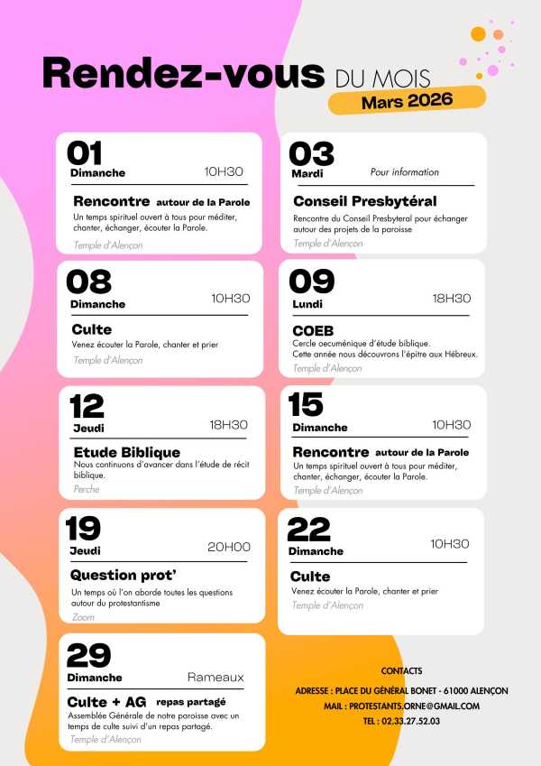 Prochains cultes et rencontres autour de la parole pour le mois de mars 2026